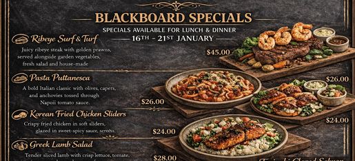Our Blackboard Specials showcase a rotating selection of chef-created dishes, crafted with fresh ingredients and bold flavours to bring you something new and exciting each week. Available for lunch and dinner, these limited-time specials highlight seasonal favourites, pub classics with a twist, and comfort meals you’ll keep coming back for.
